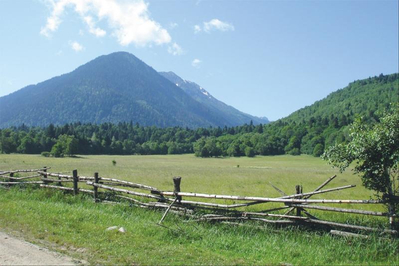 По пути попадаются живописные водопадики, ручейки и специально оборудованные «поилки». Вода холодная, чистейшая и вкусная. Наконец горы расступаются и мы выезжаем на огромную поляну – кордон Карапыр перед Дамхурцем. Впереди справа гора Мамхурц, сзади – Закан. Через несколько минут показался поселок Дамхурц. Здесь расположены несколько оздоровительных лагерей и турбаз – цивилизация, однако. Даже телефон (спутниковый, что ли?) имеется. За Дамхурцем переправляемся по мосту на правый берег Большой Лабы и держим путь на Загедан, где находятся основная погранзастава и несколько баз. От Загедана до Пхии 7–8 км более-менее приличной грунтовки и средняя скорость уже выше – около 30 км/ч. На въезде в поселок Пхия наблюдаем наглого зайца (не хотел убегать даже с дороги) и вершину горы Закан-Сырт. Пхия – небольшой поселок, расположенный вдоль реки, основной источник доходов местного населения – лесозаготовка. Сразу за поселком брод через одноименную реку и пост пограничников. По заранее оформленным документам нас пропускают без проблем.
