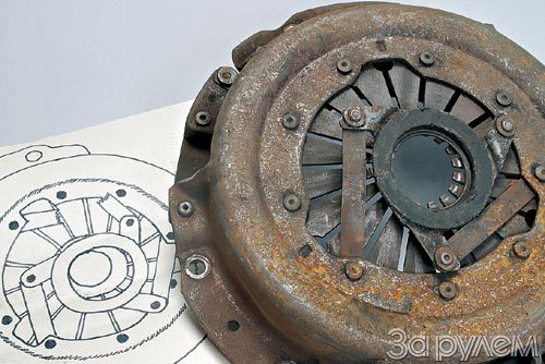 …Пока заклепки крепления надежны, поломку одной пластинки можно и не заметить. Но если уже разболтаны, подвижны или, хуже того, сломаны две из трех лапок, у фланца появляется возможность сдвигаться в сторону. Не исключено, что все начнется с несимметричного распределения сил трения между ним и лепестками диафрагменной пружины (кто гарантирует, что она идеальная?). Затем вспомним о центробежной (неуравновешенной) силе, которая действует все то время, что работает двигатель, причем растет по мере дальнейшего сдвига фланца. «Помогают» ей вездесущие вибрации. Предельно сдвинувшись, фланец может занять положение, при котором одна из проушин начнет цеплять край кожуха сцепления – и выключение муфты станет невозможным. Но при этом вращающийся фланец может касаться своей внутренней кромкой передней крышки КП – и отскакивать от нее, смещаясь к центру. При больших оборотах этому противится центробежная сила, при малых же она слаба… Видите, сколько здесь вопросов! Но кто станет все это исследовать? Остается лишь сослаться на опыт: ситуация, когда сдвинувшийся фланец видавшей виды муфты мешает ее выключению при повышенных оборотах, не исключена. Отсюда рекомендация: лучше менять сцепление в сборе, а не ждать, пока древняя «корзина» начнет рассыпаться на части.
