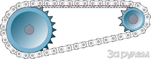 Оказывается, грохот обязан своим происхождением неоптимальной кинематике привода: звенья цепи при переходе от прямолинейного движения к «обтеканию» звездочки резко меняют свое положение и вызывают рывки. Успокоитель их сглаживает, но не устраняет шум.