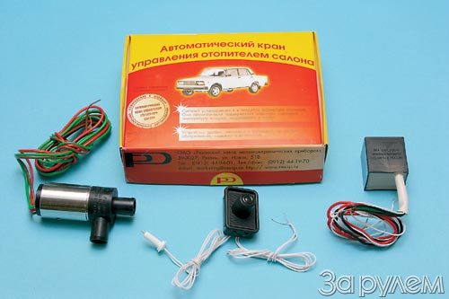 Фирма под названием «Рязанский завод металлокерамических приборов» предлагает другую схему поддержания оптимальной температуры. Устройство СУОС-1 (система управления отопителем салона) состоит из блока управления с регулятором и датчиком температуры, функционального блока и распределительного клапана (см. фото вверху). Последний нужно врезать в разрыв патрубка, соединяющего насос охлаждающей жидкости с радиатором отопителя. Температуру воздуха оценивает датчик и сообщает блоку управления.