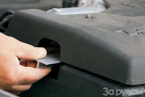 Другая опасность – сползание ремня, трущегося о реборду ролика. Вот беда, с которой порой сталкиваются владельцы 16-клапанных моторов. Проверить, не случилось ли это, позволяет вырез на основании калибра. Его длина 13 мм – расстояние от наружной поверхности крышки до кромки правильно работающего ремня. Если же последний сползает, то чаще всего к двигателю – тогда между торцом калибра и ремнем вы увидите в окошке лючка зазор. Ну а при смещении ремня в противоположную сторону заметите, что калибр уперся в ремень и не достает до крышки.