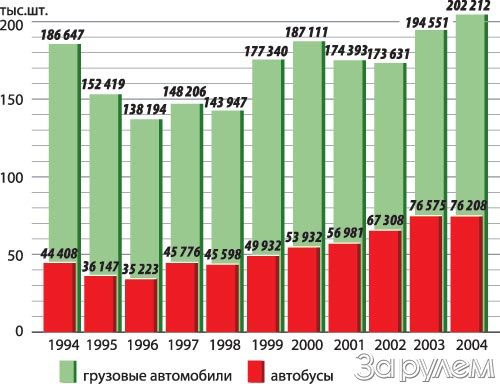Тем не менее в целом результаты 2004 года можно (и нужно!) расценивать как положительные. Грузовых, легковых автомобилей и автобусов в 2004 году изготовлено 1,4 млн., что на 8,4% больше, чем в 2003-м.