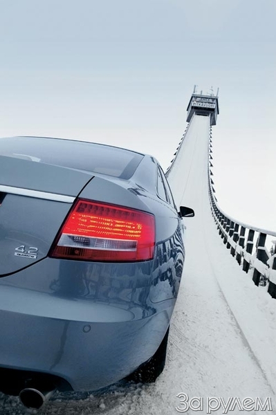 Наконец, трамплин отремонтирован, построена площадка для вертолета кинооператоров, мощный кран готов вознести «Ауди» на старт. А вдруг в конце пути откажет мотор? Ведь стояночный тормоз явно не рассчитан на уклон в 80%! Несложный расчет показал: покатись машина вниз, в момент отрыва она наберет 110 км/ч! А парашюта в списке опций версии «А6 4.2 кваттро» нет. Придумали страховочное устройство, разместив его на днище.
