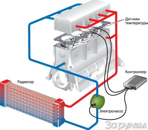 Попытки применить помпу с электроприводом и интеллектуальным управлением делались неоднократно, но желаемого эффекта не дали. С одной стороны, КПД электромотора оказался ниже, чем у ременного привода, с другой… Стало ясно, что полностью стопорить крыльчатку нельзя: в отсутствие потока жидкости датчик температуры безбожно врет и мотор перегревается.