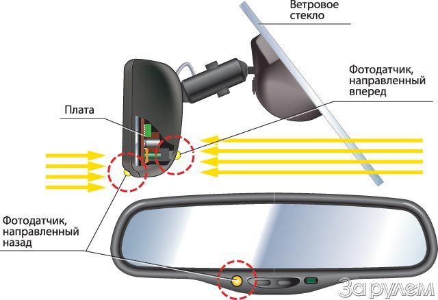 Так появились автоматически темнеющие зеркала NVS (Night Vision Safety). Прозрачностью стекла командует контроллер, сравнивающий сигналы от двух фотодатчиков. Первый, направленный вперед, измеряет общую освещенность, второй, глядя назад, ловит лучи фар едущих за вами автомобилей. Слишком большая разница между показаниями датчиков (спереди темно, сзади ярко) говорит об опасности ослепления! Тут же выдается команда затемнить стекла зеркал.