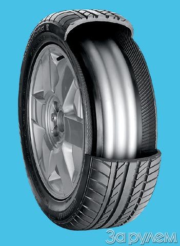 Вторая идея, известная с 1993 года, получила развитие только сейчас. Боковины шины усилены настолько, что способны держать нагрузку без помощи воздуха на протяжении 80–150 км пробега. Французы («Мишлен») назвали такие шины ZP, Zero Pressure. Немцы («Континенталь») – SSR, Self Supporting Reife. Итальянцы («Пирелли») – Euforia@. Здесь колесный диск если и отличается от обычного, то лишь увеличенными выступами-хампами, препятствующими разбортовке. А вот покрышка – продукт самых высоких технологий, использующих особые резиновые смеси. Правда, эти шины больше передают на кузов шум и вибрации от мелких неровностей дорожного покрытия.