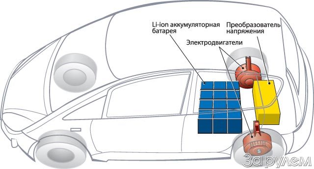 Базой для этой разработки послужила японская версия «Кольта», из которой убрали «лишнее», включая двигатель, трансмиссию, бензобак и т. д. Вместо этого появились силовой преобразователь напряжения, высоковольтная батарея емкостью 40 А.ч и два мотор-колеса мощностью по 20 кВт. Отпала необходимость и в дифференциале – моменты на колесах уравнивает электроника. Не за горами и полноприводный образец. «Кольт MIEV» не станет серийным, но позволит отработать многие технологические решения для будущего водородомобиля – в конце концов, мотор-колесам все равно откуда берется ток.