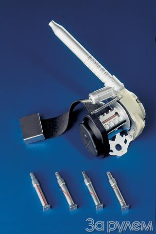 Суть идеи в том, что на ось подпружиненной катушки, наматывающей ремень, надели звездочку, которая вращается набором шариков. Их толкают по трубке пороховые газы из специального пиропатрона. Последний срабатывает параллельно с патроном подушки, моментально выбирая слабину ремня. А чтобы у седока не перехватило дыхание, ось при определенном усилии на ленте (около 400 кгс) закручивается как торсион, ограничивая величину натяжения.