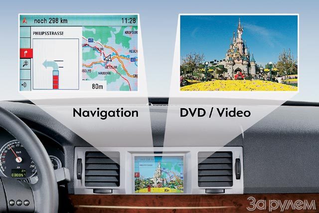 Всем известный недостаток подобных мониторов – ограниченный угол обзора – удалось превратить в преимущество. Изображение на экране «Дуал Вью», установленном на центральной консоли демонстрационного «Опеля-Вектра Караван», хорошо видно и водителю, и пассажиру. Вот только каждый смотрит на... свою картинку. Пока пассажир развлекается фильмом с DVD-плейера, водитель изучает карту и указания бортового навигатора. На стоянке, разумеется, можно посмотреть фильм и вдвоем, но только пока не заработал мотор. Безопасность нынче превыше всего!
