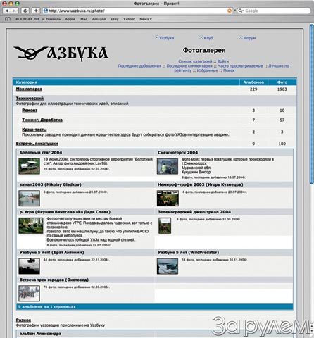 Удивительное на этом сайте – на каждом шагу. Где еще вы найдете программу для расчета затрат на эксплуатацию ульяновских вседорожников? Или рецепты откручивания «закисших» болтов и гаек? Тут и новости из мира УАЗов, характеристики и фото самых разных моделей и концептуальных разработок, «матчасть» с подробным описанием узлов машин, их взаимозаменяемости и возможности доработок. Отдельная глава адресована тем, кто намеревается подготовить автомобиль к соревнованиям. И конечно же, есть на сайте фото членов клуба «уазоводов» – таковых, кстати, более двух сотен. Быть может, кто-нибудь из них однажды вытащит вас из снежного плена или размытой колеи…