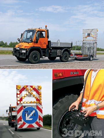 На прошедших в Папенбурге «Технологических днях» собравшиеся с интересом знакомились с новинкой фирмы «Даймлер-Крайслер» – дистанционно управляемым «Унимогом». Теперь машина с предупреждающим знаком и сверкающей стрелкой объезда будет ползти, прикрывая собой колонну, без водителя в кабине. Он может спокойно и в безопасности идти рядом (скажем, за разделительным барьером, по обочине) с пультом дистанционного управления на ремне.