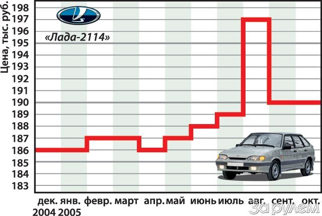 Очередная ценовая волна накрыла рынок в октябре, в преддверье наступления холодов. В течение осени сам завод не раз менял рекомендованные цены – естественно, в сторону увеличения. Так, в середине октября в среднем все машины ВАЗа подорожали примерно на 1,5–3 тыс. (до этого подобная «корректировка» была проведена 1 сентября). Теперь рекомендованная цена VAZ 2105 – от 118,6 тыс. руб., VAZ 2107 – от 131,8 тыс., моделей семейства «Самара-2» – от 186,1 тыс. (здесь самая дешевая переднеприводная модель – трехдверный хэтчбек VAZ 2113), седана VAZ 2110 – от 230, 3 тыс. и «Калины» – от 224,2 тыс. рублей.