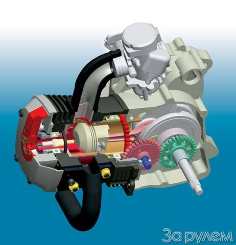 Как выяснилось, мотор с вращающимся цилиндром объединяет достоинства обычных двигателей с двух- и четырехклапанной головкой. Смесь в нем интенсивно закручивается и сгорание получается более полным. В итоге даже без наддува получена удельная мощность 100 л.с./л! Как утверждают разработчики, экологи тоже довольны: эмиссия углеводородов и CO2 заметно снизилась.