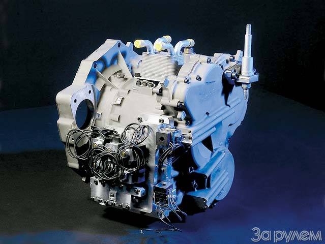Не вдаваясь в тонкости устройства, скажем лишь, что крутящий момент в нем передают два параллельно работающих трехступенчатых модуля (см. ЗР, 1998, № 1; 2002, № 3). Это весьма напоминает идеологию коробок с двойным сцеплением DSG, только сами модули здесь с планетарными наборами шестерен, потому вся коробка гораздо более компактна. Переключение от передач происходит путем включения тех или иных фрикционов. А роль сцепления также выполняет один из этих фрикционов, работающий в масле.
