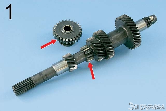 Мы разобрали коробку: это аналог агрегата, которым оснащены «десятки», разве что в «калиновской» появился датчик блокировки включения заднего хода. Вещь полезная, но к нашему случаю никакого отношения не имеет. Виновники воя – на фото 1. Картина типичная – хоть учащихся заводского ПТУ учи! На зубьях шестерни заднего хода (на первичном валу) и промежуточной шестерни – признаки преждевременного износа: риски, задиры… Не рановато ли появились? Но факты – упрямая вещь. Пришлось покупать новые детали, а долго ли они прослужат, бог знает.