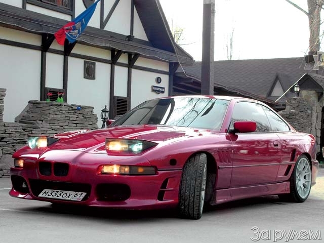 Эту вишневую «восьмерку» БМВ взгляд мгновенно выхватывает из потока. Силуэт баварской красавицы узнается безошибочно, а вот пластиковый обвес заставляет гадать. Отчасти похоже на стиль «Хартге», но может принадлежать и другому немецкому ателье – уж очень фирменно выглядит обновленный экстерьер.