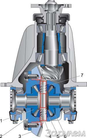 Верных ответов совсем не много, и все же нашлись среди читателей те, кто разобрался в «механике»: искать источник стуков они стали в низкооборотной части трансмиссии – от большой шестерни до колес. Так и пришли к дифференциалу. Победитель этого тура напомнил, что ось сателлитов, разбив посадочные отверстия в коробке (см. рис.), начинает свободно перемещаться от упора до упора – ограничивает его внутренняя поверхность большой шестерни. Что получится, если машина очень медленно катится на нейтрали? Вот ось сателлитов прошла нижнее положение, потом поднимается… и, повернувшись на 180°, вновь падает. Мы слышим удар. Еще через 180° картина повторяется. Два четких удара на каждый оборот коробки дифференциала, то есть колес.