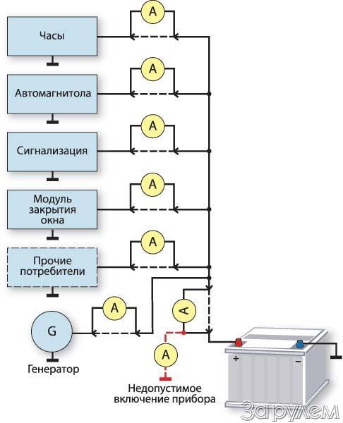Фантастика? Да ничего похожего! Конечно, кто-то из «продвинутых» скажет, что батарея в тот раз скорей всего села из-за того, что легкомысленный хозяин забыл выключить, например, стояночный свет. Увы, не угадали! Все, что питается через замок зажигания, клавиши, кнопки на панели приборов или консоли, было отключено. Покидая машину, всякий внимательный хозяин за этим следит. Но действительно ли обесточиваются все цепи? Оказывается, нет. На современном автомобиле это можно гарантировать только отключением батареи. Да и то сказать… Известно такое явление, как саморазряд батареи. Тут и отключение клеммы не поможет. Но наша нынешняя беседа о других утечках. На автомобиле постоянно включены контроллер системы впрыска (блок управления), часы, сигнализация. Как правило, напрямую подают питание на магнитолу, модуль подъема стекол дверей. Иногда к ним добавляются и другие потребители. Порой – вопреки воле владельца, не заметившего неисправность.