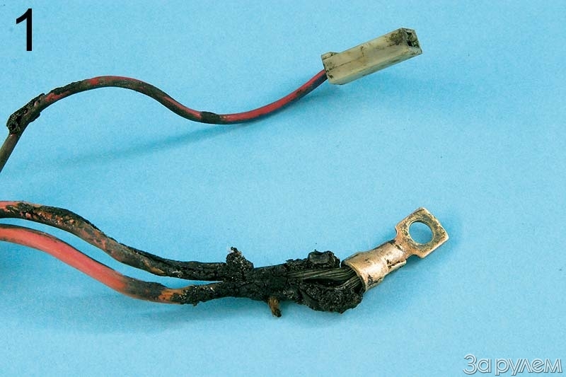 Правда, к этому времени уже жарко горел под капотом один из жгутов проводки, капал расплавленный хлорвинил, но костру не было суждено перерасти в пожар. Хозяин погасил его, даже не обжегшись, вот только вонючим дымом надышался… Когда от сердца отлегло, приступил к детальному осмотру и вскоре понял, насколько обширны повреждения. Мало того, что горящие провода замкнулись между собой. Погиб и монтажный блок, где некоторые разъемы оплавились так, что провода не отстыковать. На фото 1 – «шкварки», оставшиеся от проводов: тот, что вверху, идет на клемму 61 генератора, нижний – на клемму 30.