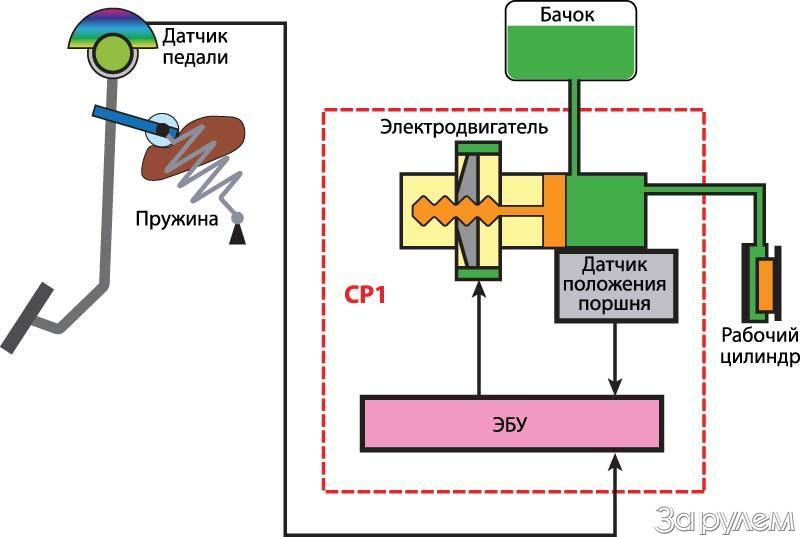 Небольшой узел массой около 2,5 кг содержит главный цилиндр, поршень с винтовым штоком и бесщеточный электромотор постоянного тока. Кроме этого, где-то в недрах спрятаны управляющая электроника и датчик положения поршня либо давления в цилиндре. Чтобы уменьшить трение, гайка (она же ротор электромотора) заполнена внутри шариками, обкатывающими «резьбу» на штоке. В общем, все просто: водитель нажал на педаль и связанный с ней реостат дал сигнал управляющей электронике, которая запускает электромотор. Поршень движется вперед и через гидропривод выключает сцепление. Усилие на педали при этом минимально, нога не устает.
