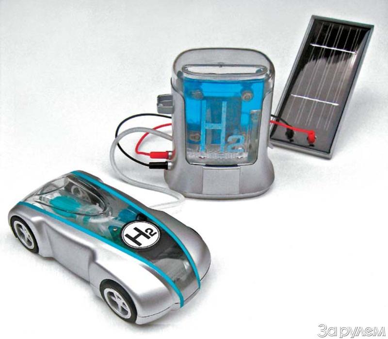 Итак, нужно только залить стакан воды в прозрачный бачок колонки и подключить ее к прилагаемой солнечной батарее. (А вы как думали – никакого расхода ископаемых ресурсов!) Пузырьки водорода соберутся вверху и через пластиковую трубочку приступайте к заправке прозрачного бака авто, роль которого выполняет небольшой воздушный шарик. Потом газ поступит в самый настоящий топливный элемент, тот выработает ток, а уж электромоторчики-то давно освоены. Теперь повернем выключатель и насладимся бесшумным бегом экологически чистого «болида», в котором не нужно даже менять батарейки.