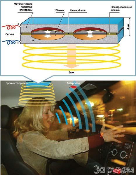 Сэндвич имеет толщину всего 4 мм, а пленочная мембрана колеблется с амплитудой до 0,16 мм. Благодаря солидной площади излучателя легко достигается уровень звукового давления 90 дБ, но самое главное – это узкая диаграмма направленности: звук распространяется практически только вниз, к «нужной» голове. Остальным его музыка почти не слышна, если только он не раскроет на коленях, к примеру, журнал «За рулем» – его страницы могут отразить звуковые волны. Тут уж либо слушать, либо читать.