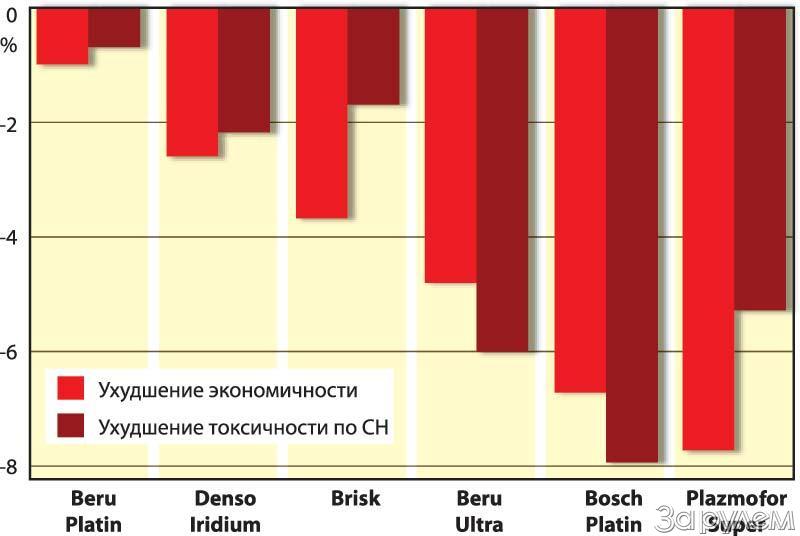 Лидер предыдущего «большого» теста подтвердил, что это – типично европейские свечи. И любят они только хорошее топливо! А вот с ферроценом они резко сдали. Расход топлива подпрыгнул на 7%, а выбросы по СН – аж на 20%.