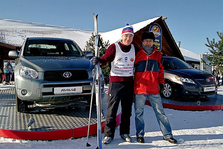 Зачем? А затем, чтобы доказать себе и своим детям – мы можем и должны жить культурно и свободно! Мы хотим получать удовольствие от передвижения в пространстве – не важно, за рулем или на лыжах. И мы умеем обходиться без палки надсмотрщика – как полосатой, так и любой другой. От ЗР в главной гонке страны принял участие, конечно же, главный редактор. Каким он был на финише? Не будем хвастаться – догадайтесь сами! На фото – главный редактор «За рулем» Петр Меньших и президент ООО «Тойота Мотор» г-н Томоаки Ниситани.