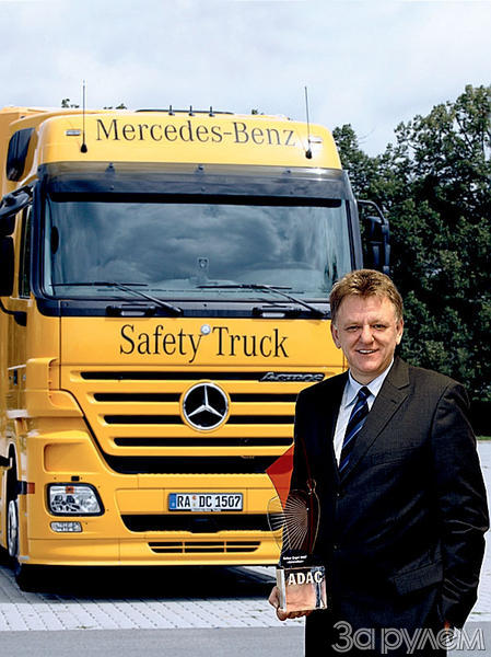 Система торможения Mercedes-Benz Active Brace Assist и оснащенный ею грузовик Actros Safety Truck отмечены престижными премиями: бельгийской Safety Award 2007 и «Желтым ангелом-2007» немецкого автоклуба ADAC. В основе новинки – три радара поддержания безопасной дистанции Telligent. Об опасности столкновения предупреждают световой и звуковой сигналы. В случае бездействия водителя система автоматически задействует тормоза примерно на 30%, затем применит экстренное торможение. На фото: «Желтый ангел-2007» в руках Андреаса Реншлера, отвечающего за грузовые автомобили и автобусы «Мерседес».