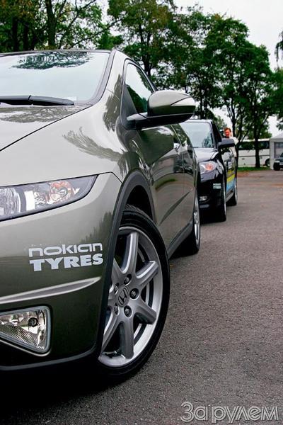 Впрочем, шины с таким изящным, проработанным рисунком протектора даже жаль использовать по прямому назначению. Тем более что в день презентации на шершавом асфальте «Невского кольца»* им предстояла нелегкая работа: прохождение сухого участка трассы на максимально возможной скорости, «фигурка» и «лосиный тест» на мокром покрытии. Автомобили – от «Лексуса-IS250» до «трешки» БМВ и «Хонды-Сивик». К сожалению, полноценного теста на аквапланирование не получилось – торможение и «переставку» выполняли просто на мокром асфальте. Зато на дуге возвращения оказалась здоровенная российская лужа, в которой я и пытался нащупать грань срыва колес в скольжение. Судя по первым впечатлениям, шина действительно очень эффективно отводит воду – большой разницы между лужей и просто мокрым асфальтом я не заметил. Тормоза на мокром хорошие, а вот с рулем нужно обращаться, как всегда, осторожно – на больших углах поворота возникает затяжное скольжение. Зато на сухом асфальте даже в предельных режимах шины остаются очень предсказуемыми, без резких срывов. Иногда создается впечатление, что автомобиль сам выбирает траекторию в повороте и держится за нее мертвой хваткой, демпфируя подруливание. Для гонок, конечно, это не годится, а вот среднему водителю во многих ситуациях такой покладистый характер шин сослужит добрую службу.