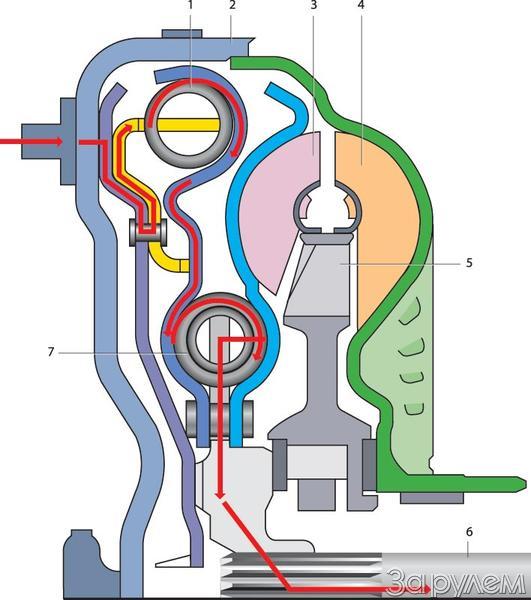 Серьезно модернизирована и «механика» агрегата. Чтобы избежать пробуксовок, ведущих к потере мощности, коробку снабдили устройством, включающим два гасителя крутильных колебаний, отдаленно напоминающих демпферы на диске механического сцепления (см. рис.). Первый (его называют добавочным) существенно сглаживает неизбежные для любого, даже самого совершенного, «автомата» скачки нагрузки при переключении передач. Основной, так называемый турбинный гаситель жестко соединен с одноименным колесом гидротрансформатора. Он позволяет ездить с замкнутой муфтой при более низких, чем прежде, оборотах двигателя.