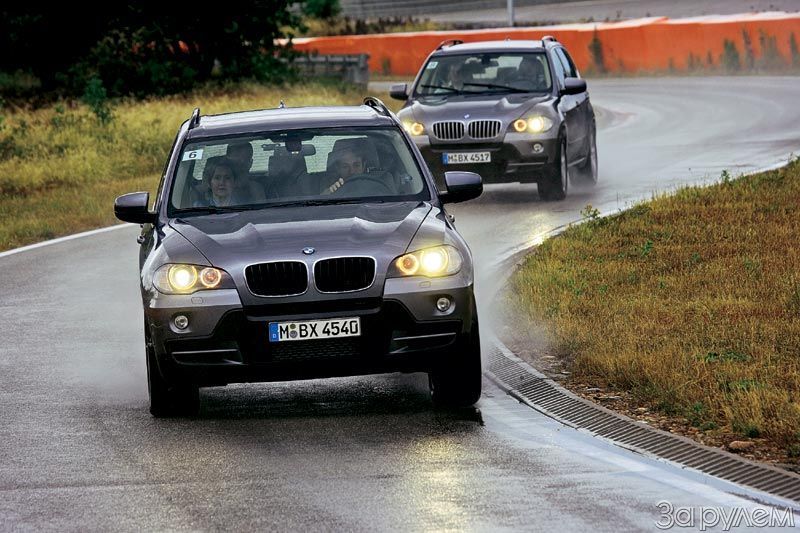 «Первый круг проходим спокойно, знакомимся с поворотами. Второй побыстрее… и не забывайте фиксировать ощущения», – напутствует сосед. Тестовый Х5 гладко прописывает виражи, лишь изредка, когда я увлекаюсь, покрякивая системой стабилизации. Круг пройден – испытатель щелкает тумблером, и автомобиль превращается в обычный серийный вседорожник без системы DPC. Разницу почувствовал уже после пары поворотов. Машина стала более нервной – на дуге я постоянно корректировал ее поведение рулем и газом. Уверенность вернулась лишь на следующем круге, когда вновь заработал активный дифференциал. В том же месте, где несколькими минутами ранее X5 пытался уйти с траектории, он послушно ввинтился в поворот без проскальзывания колес. Не ожидал!