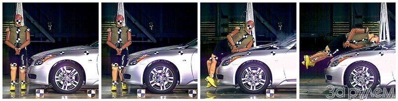 На новом купе «Ниссан-Скайлайн» появится POP-UP капот, позволяющий сберечь пешеходов от тяжелых травм. Принцип его работы таков: датчики в бампере регистрируют наезд на пешехода и дают команду специальному пиропатрону, поднимающему заднюю часть капота. Тем самым обеспечивается спасительный зазор между сравнительно мягким капотом и узлами двигателя.
