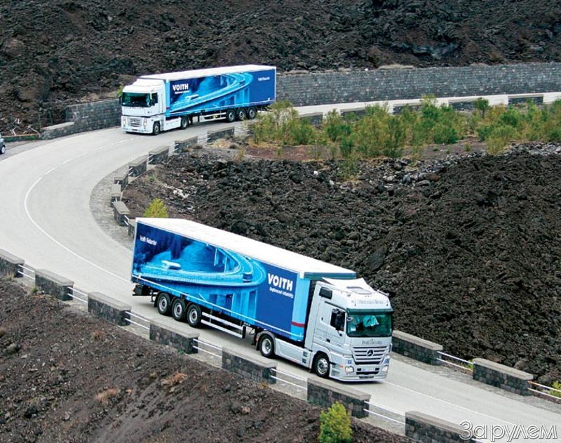 Оценить достоинства автопоездов, оснащенных ретардерами, предстояло, что называется, на собственной шкуре – «Фойт» позаботился о такой возможности. Полигон – серпантин на склонах вулкана Этна, что на Сицилии. Недавнее извержение не повредило дорогу, а небольшой дымок из кратеров – не помеха.