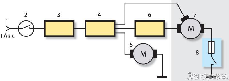 Питание +12 В подается от АКБ 1 на замок зажигания 2, далее на блок предохранителей 3, подрулевой переключатель 4, а с него на мотор дворников 7 через реле паузы 6, либо напрямую, после чего через биметаллический предохранитель 8 замыкается на «массу». Предохранитель защищает обмотки электродвигателя от перегрузки в случаях, когда механизм чем-нибудь заблокирован: примерзли щетки, закисли шарниры, в трапецию попала тряпка и т.п. Отдельно через выключатель дворников питается мотор 5 омывателя.