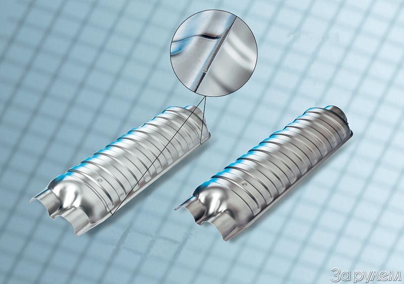 В серию титановые глушители пойдут в 2010 году, а пока – промежуточное решение. Специалисты фирмы разработали технологию изготовления деталей глушителя из многослойных сварных полосок стали. Это позволило уменьшить толщину металла в определенных местах до 0,7 мм вместо 1,2 мм «по кругу» без ущерба для прочности и долговечности изделия. Конечно, о 40% снижения массы тут речь не идет, но и 26%, согласитесь, очень неплохо. Более того, усложнение технологии полностью окупается меньшей металлоемкостью. И три года ждать не нужно.