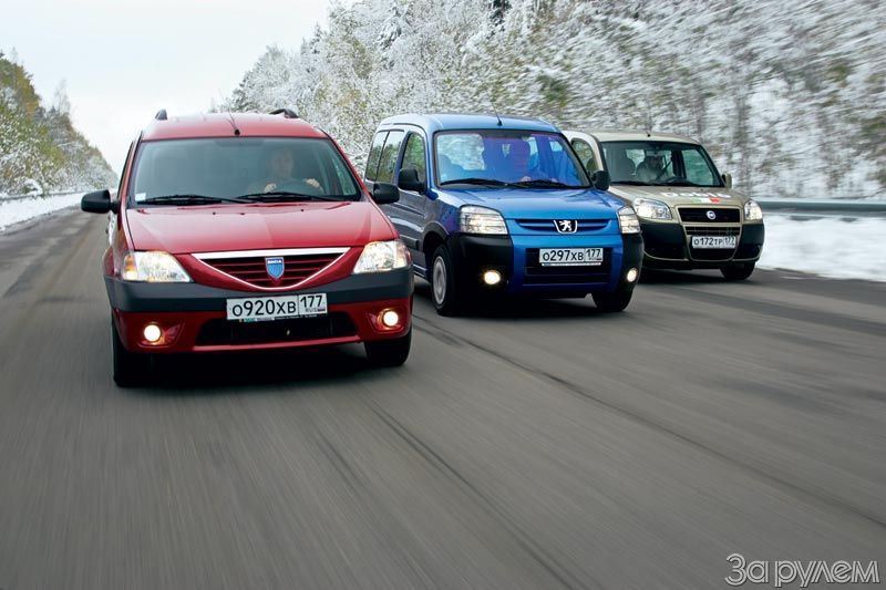 Вытянувшийся вверх, словно подросток-акселерат, «Добло» и напоминающий его уменьшенную копию «Пежо-Партнер» – представители классической грузопассажирской школы. Необычный профиль «Логана» узнаваем еще больше: чистокровная такса! «Дачия» длиннее ФИАТа на 197 мм, а «Пежо» – на целых 310 мм. С высотой кузовов картина обратная: «Логан» ниже ФИАТа на 178 мм, поэтому румынская машина воспринимается как легковая. Может, все изменится, когда заглянем в салоны?