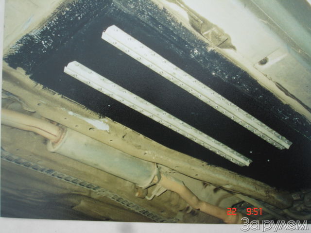 Теперь сами объемы под днищем. Сделав из плотного картона макеты и не один раз их перекраивая, в конечном итоге, получились «ванны» из той же двухмиллиметровой стали. Грунтовка, мастика и, само собой, крепление к кузову. Установка аналогична - через мастику и заклепки. После прослушивания были добавлены ребра жесткости вдоль ванночек.
