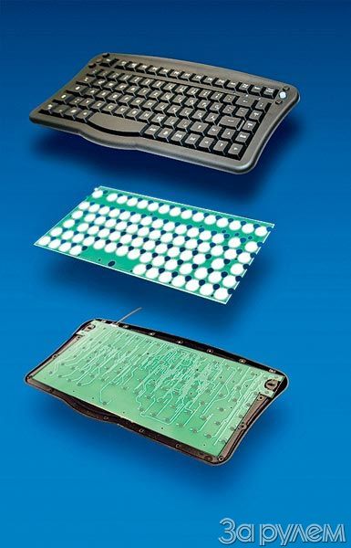 Разумеется, для коммутации нужна еще контактная подложка, но эта технология давно освоена изготовителями клавиатур для компьютеров, калькуляторов и телефонов. Главное - целые ленты таких переключателей можно просто наклеивать в нужном месте, причем управляющий компьютер будет подсвечивать лишь кнопки, активные в данный момент. Например, если стекло поднято, то светится лишь «кнопка», его опускающая.