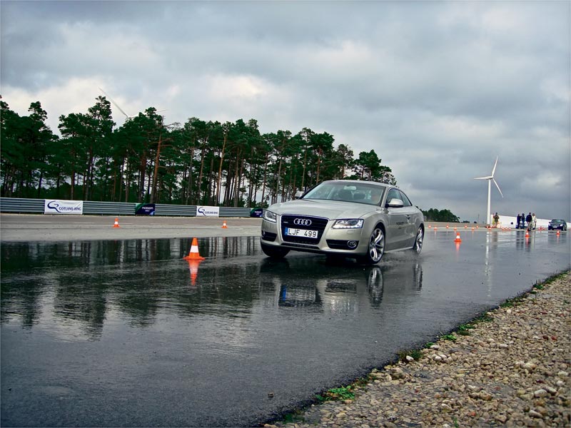 Не успев запомнить замысловатую трассу, на втором круге в повороте перебираю с газом и теряю траекторию, но вернуться на нее не составляет труда. Чуть сбавляю скорость, и «Ауди» снова «встает на рельсы». Причем уход в занос нерезкий – все происходит очень плавно.