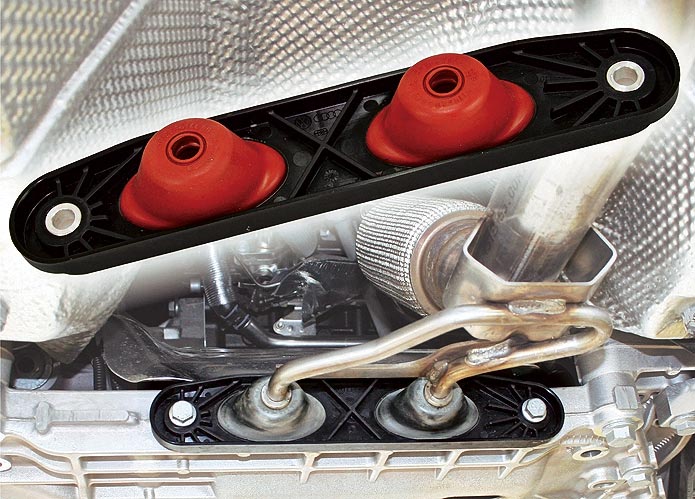 Очередные две новинки подготовил концерн «Дюпон». Разработанный материал «Зитель» выдерживает температуру +175°С, что позволило применить его для кронштейна выпускной системы. Приваренные к трубе стальные прутки отныне заделаны в пластине из Zytel 70G35HSL, представляющем собой полиамид РА66, усиленный 35-процентной добавкой стекловолокна. В итоге держатель, который раньше в «Фольксвагене-Гольф» весил около 300 г, похудел до 165. Вот так, по зернышку, уменьшается масса автомобиля либо появляется возможность израсходовать освободившиеся граммы на что-то более полезное, чем кусок железа.
