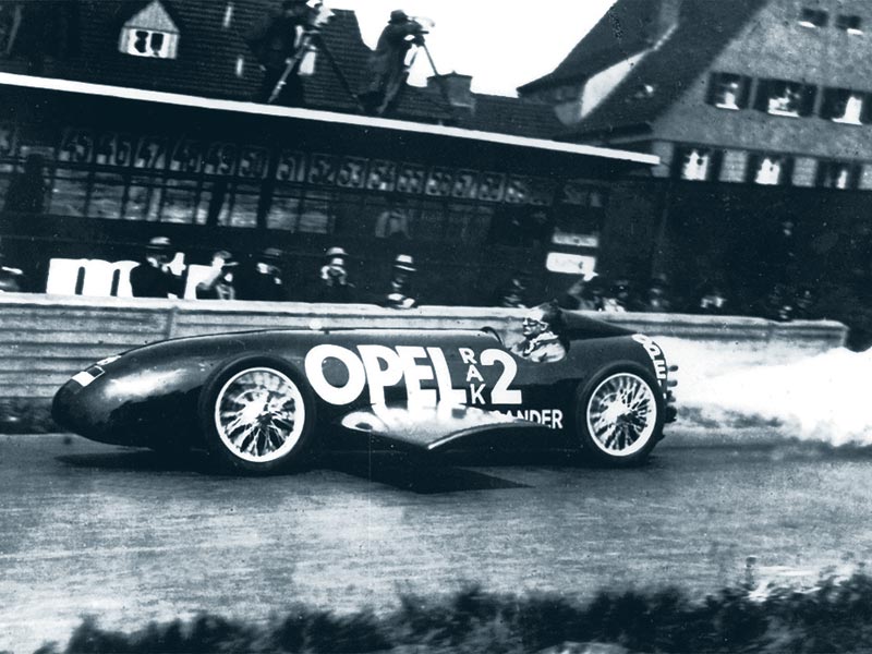 80 лет назад состоялся первый публичный заезд ракетомобиля «Опель-RAK1», построенного на шасси модели 4/12 PS. Каждое нажатие пилотом педали газа должно было поджигать очередную пару из 12 твердотопливных ракет, но устройство сработало лишь трижды – прогорел кабель. Так что набрать более 100 км/ч тогда не удалось. Однако в том же году последовали заезды RAK2, развившего 238 км/ч, и RAK3 – 256 км/ч. Впрочем, последний был скорее ракетной дрезиной, поскольку катился по рельсам.