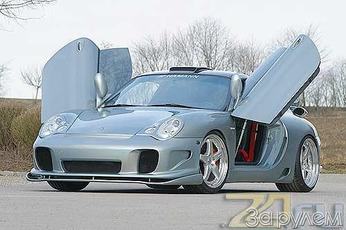 Автомобиль Porsche 911 GT3, который и так многим кажется совершенным, подвергся глобальным переделкам. Немецкие настройщики осмелились изменить даже силовую структуру кузова, сделав у 911-го двери, открывающиеся вперед-вверх, что-то среднее между "гильотинными" и "крылом чайки". Эта схема была обкатана ателье на BMW M3, которую немцы показывали в прошлом году в Эссене под именем Las Vegas Wings.