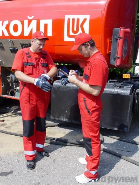 Но вот два человека нашей бригады - Роман Гуреев и Александр Паданов - не менялись в течение всего марафона. Более того, они не садились за руль наших "болидов" вообще. И тем не менее, без них ни одна машина просто не сдвинулась бы с места. Потому что эти два молодых москвича, работающие в компании "Лукойл", обеспечивали нас топливом.