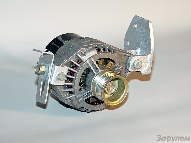 Поликлиновой ремень, подходящий для нашей затеи, – длиной 882 мм. Установив на свои места генератор и шкивы, мы проверили стальной линейкой совпадение плоскостей вращения ручьев на шкивах. (При необходимости возможна регулировка – например, небольшим смещением генератора – в пределах зазоров по отверстиям кронштейнов, установкой прокладок-шайб под шкивы и т.п.)
