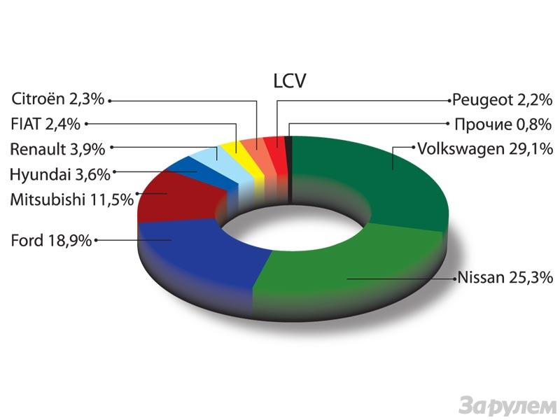 Если рассматривать парк по маркам, вырисовывается интересная картина. В дивизионе LCV на долю четырех лидирующих брендов приходятся 84%! При этом «Фольксваген» с показателем 29% и «Форд» с 19% сосредоточены в основном в западных регионах страны, а «Ниссан» с 25% и «Мицубиси» с 11% – в восточных. Но здесь необходимо сделать одну оговорку – из-за особенностей регистрации в ГАИ-ГИБДД из рассмотрения почему-то выпал «Мерседес», который наверняка также оказался бы в числе лидеров.