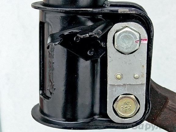 Показанное приспособление-шаблон помогает заменить амортизаторную стойку, практически исключая нарушение угла развала переднего колеса. Прежде чем отвернуть «развальный» болт, плотно надеваем шаблон на головки обоих болтов – и острым зубилом делаем на головке «развального» метку напротив метки на шаблоне. Теперь можно демонтировать стойку. Установив новую, регулировочный болт ставим в прежнее положение. Если работать добросовестно, угол развала останется практически тем же, что и со старой стойкой.