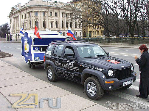 Путешественники едут на машине, предоставленной петербургской компанией "НордАвтоГруп", партнером ДаймлерКрайслер Автомобили РУС (г. Москва). Новый Cherokee (напомним, это имя машина получила от названия индейского племени), выпускаемый в Америке под маркой Liberty, выставлялся в автосалоне. 18 апреля, когда петербургский завод "Энергия" достроил трейлер для путешествия, Cherokee выехал в Москву на Jeep Experience Day. Там, на трассе технических видов спорта в Крылатском, состоялся двухдневный тест-драйв американских джипов. На него пригласили узкий круг состоятельных людей, в том числе чиновников. Им предоставили десять машин для пробных заездов. Cherokee из Петербурга в заездах не участвовал: его пригласили для демонстрационных целей - москвичи делали большие глаза и живо интересовались тем, "как эта машина будет шарахаться по самым высоким горам Европы". Путешественники отвечали им, что их главная задача - рассказать европейцам о том, что "есть такой город Петербург и ему исполняется 300 лет". Для этого трейлер оборудован наружными динамиками и иллюминацией. Даже в темное время она позволит разглядеть надписи, а тем, кто бывал в Петербурге, форма трейлера напомнит пятиугольник Петропавловской крепости - официальную эмблему 300-летия Петербурга.