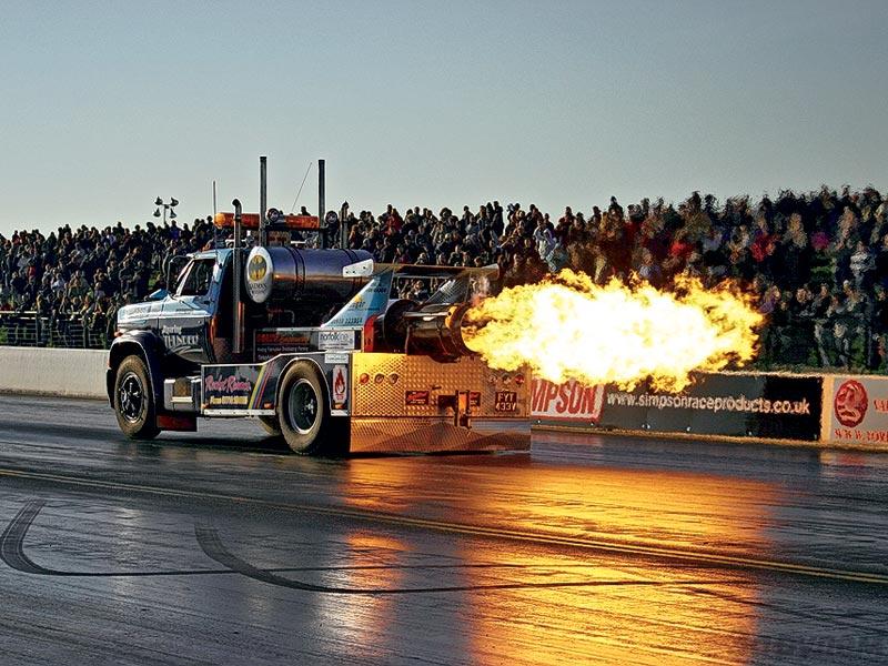 Вот такие старты с десятиметровой реактивной струей наблюдали зрители шоу «Флэйм энд Тандер» (Flame & Thunder) на трибунах английского городка Санта-Под. Реактивный грузовик развил скорость 432 км/ч, а другой успешно давил огромными колесами легковых собратьев.