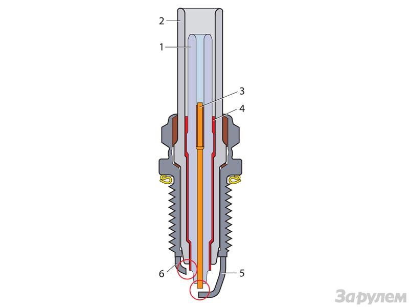 В двойной свече, предложенной Ликовски, все удвоено: изоляторы (1, 2), центральные (3, 4) и боковые (5, 6) электроды. Для ее работы понадобятся и две катушки зажигания.
